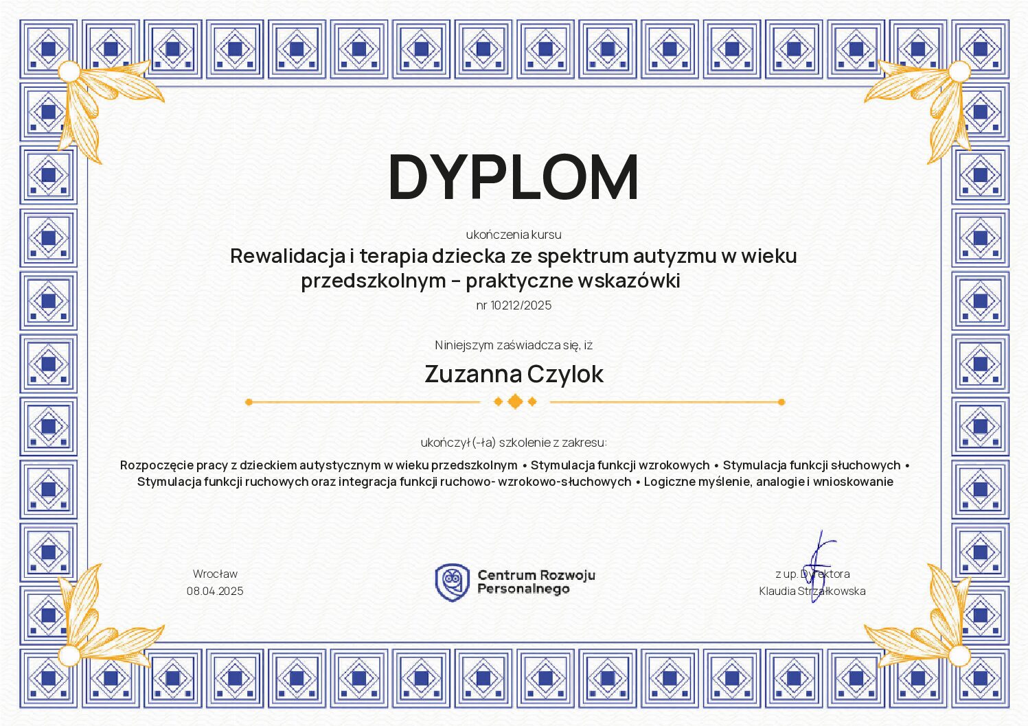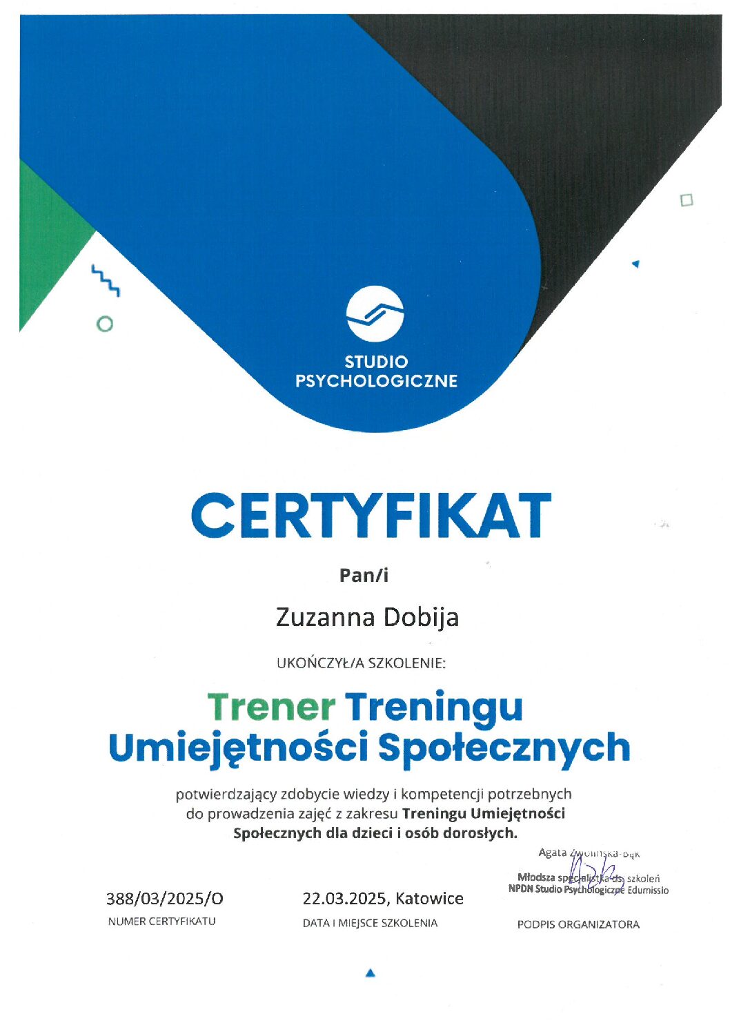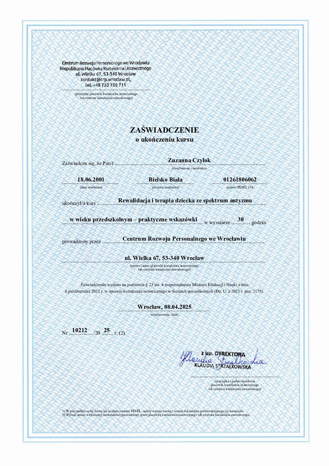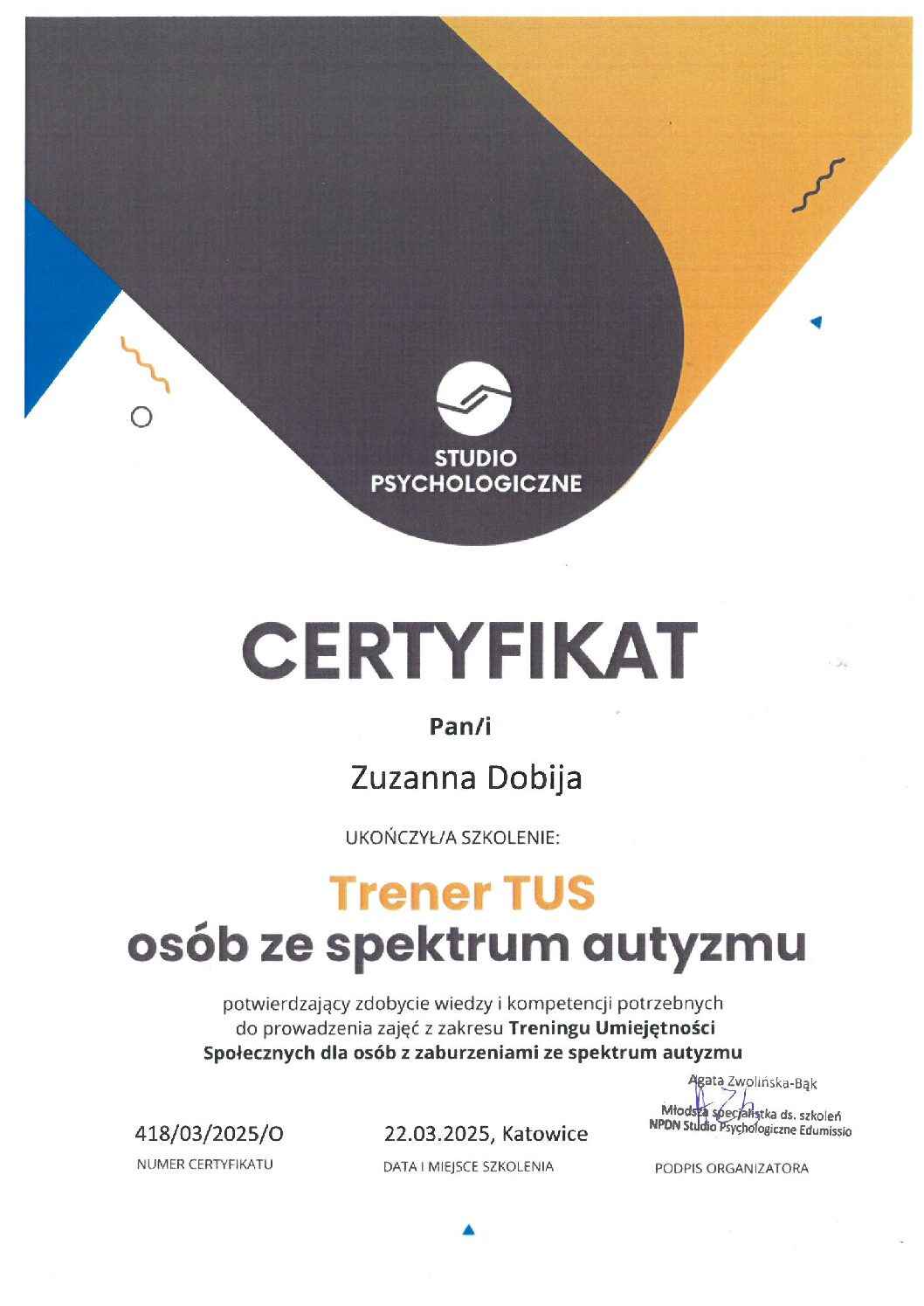 Ukończyłam szkolenia trenerskie z zakresu Treningu Umiejętności Społecznych I i II stopnia ze specjalnością dzieci w spektrum (TUS) oraz regulacji emocji, a także liczne kursy specjalistyczne związane z terapią i wspieraniem rozwoju dzieci.