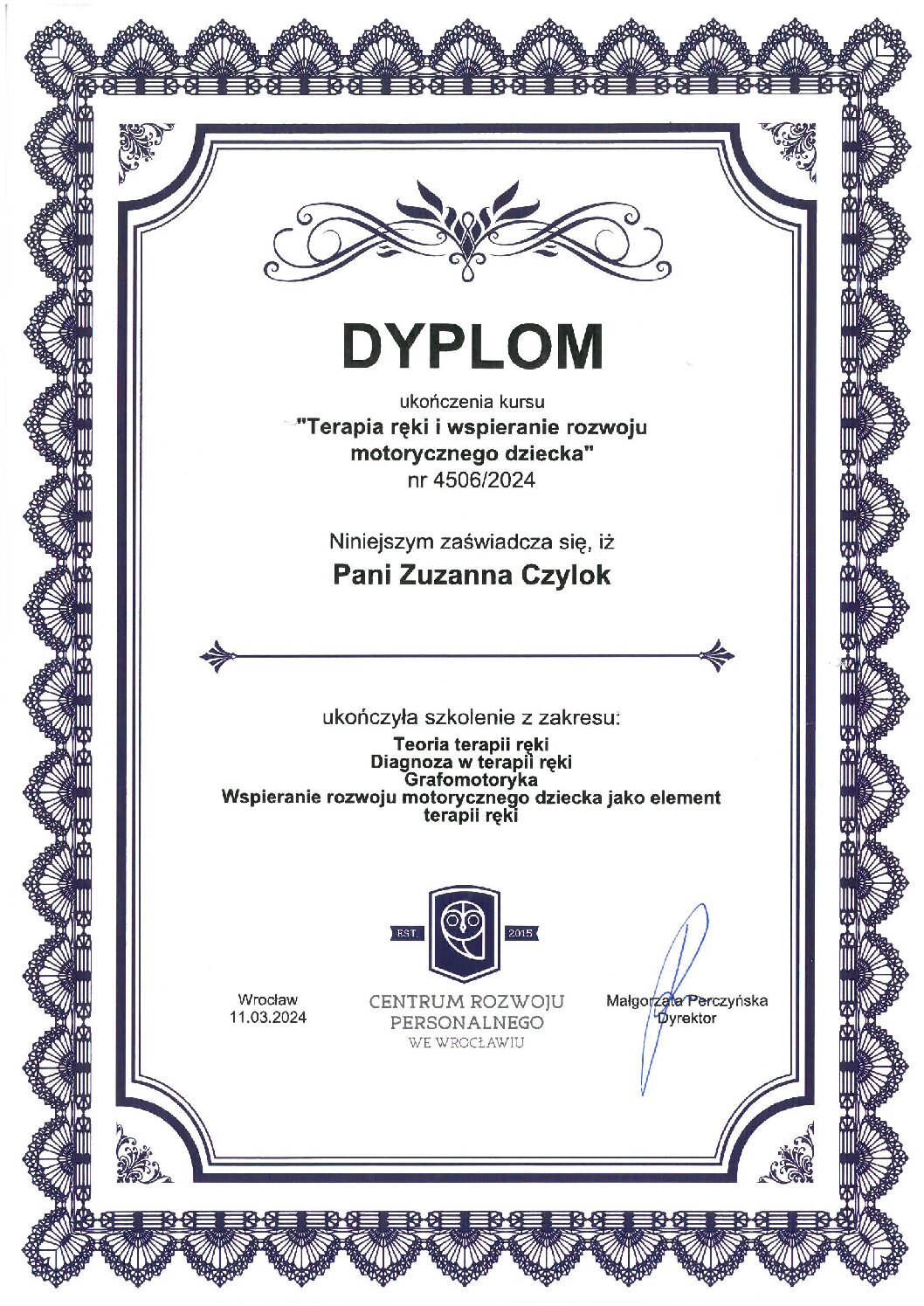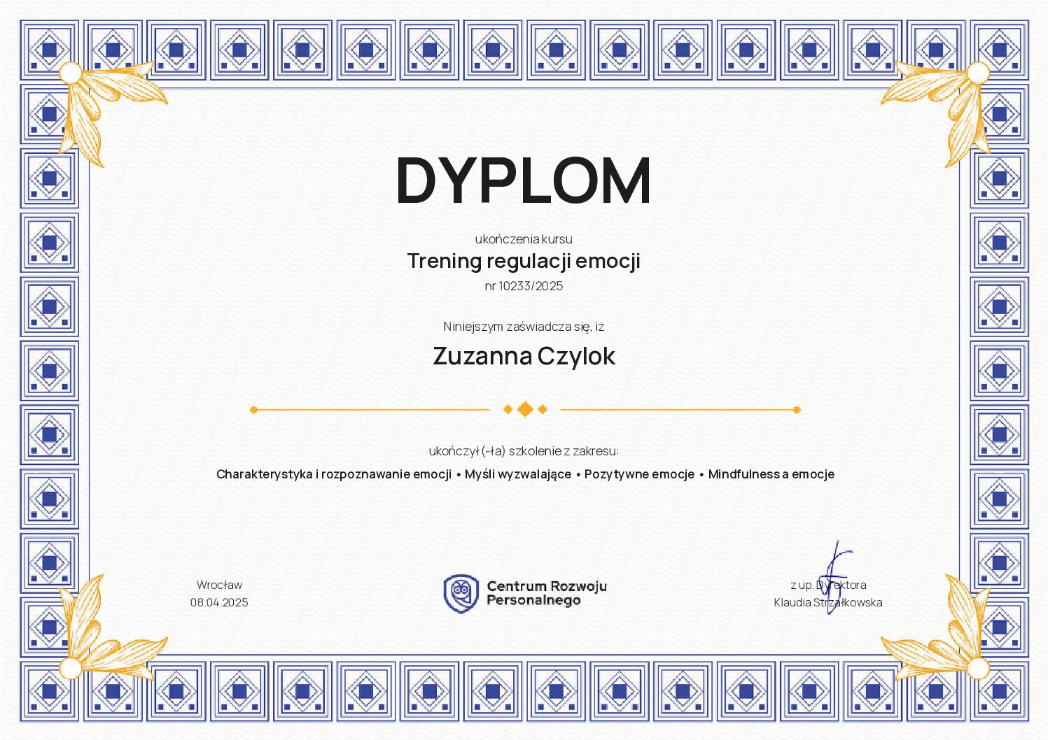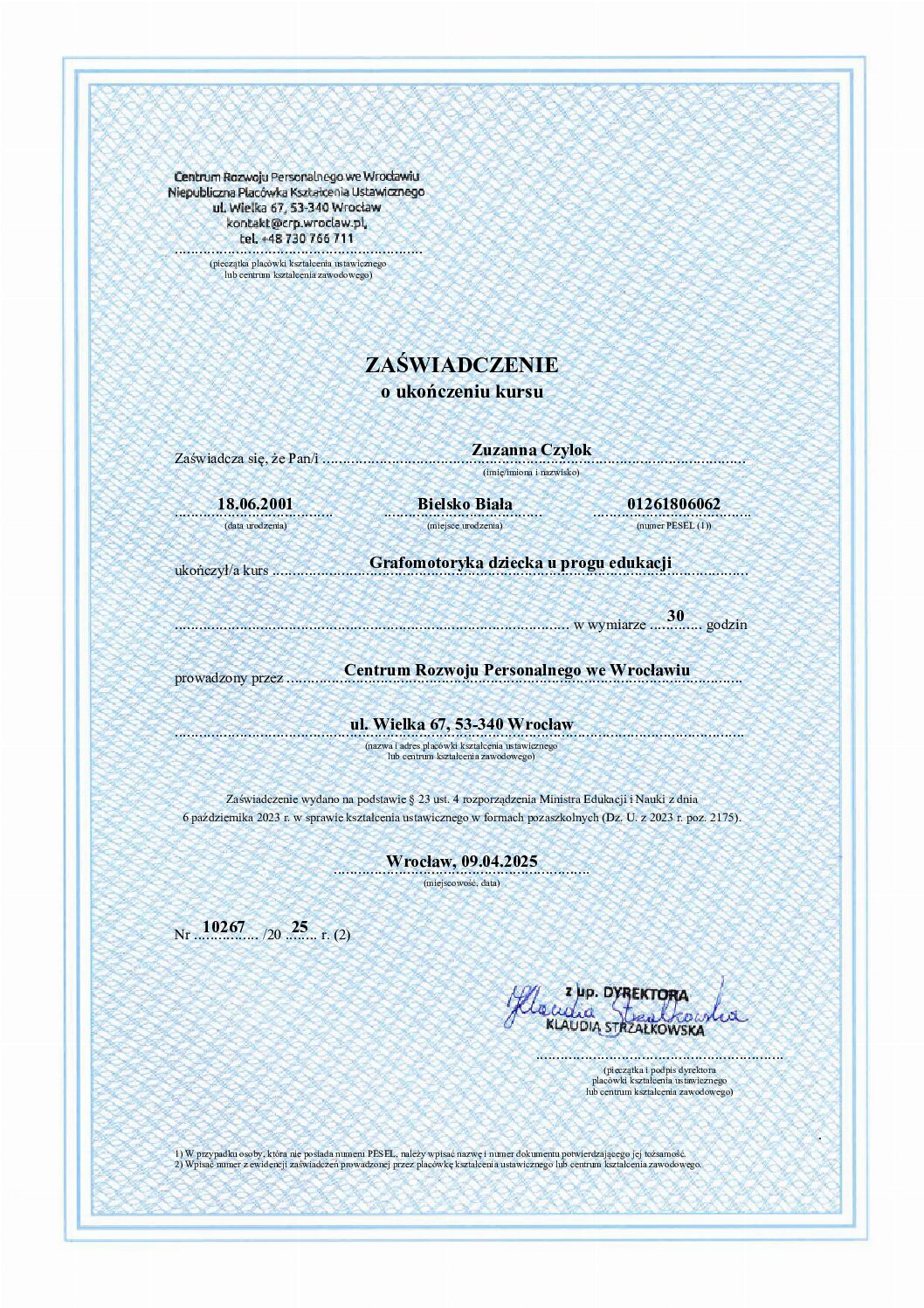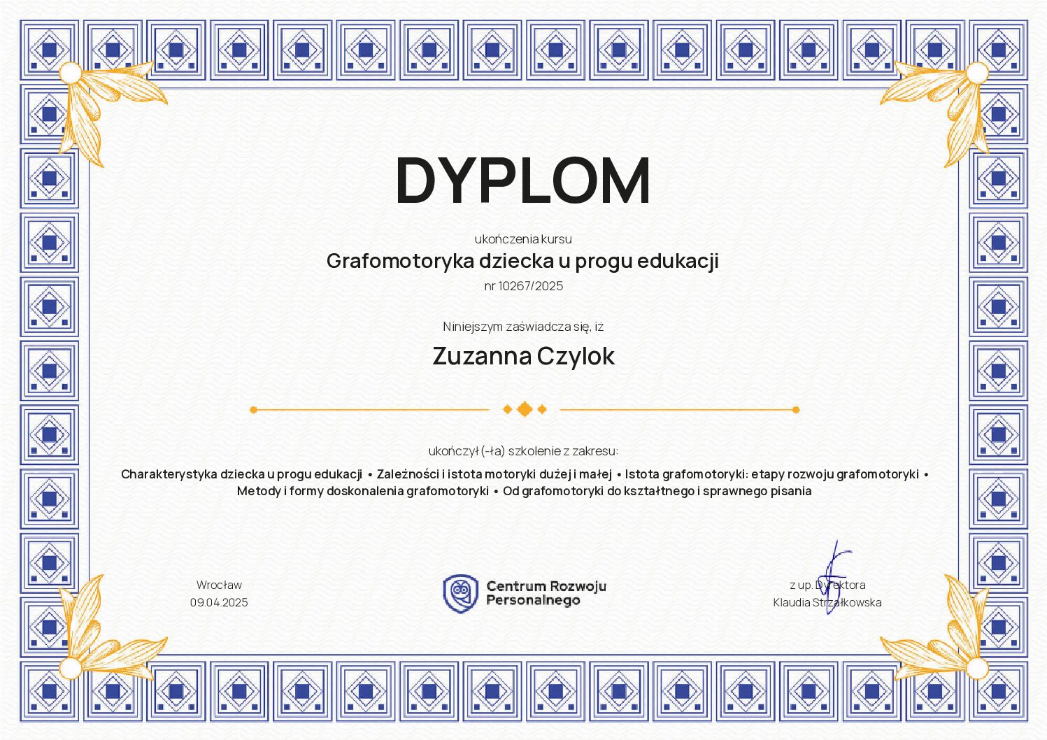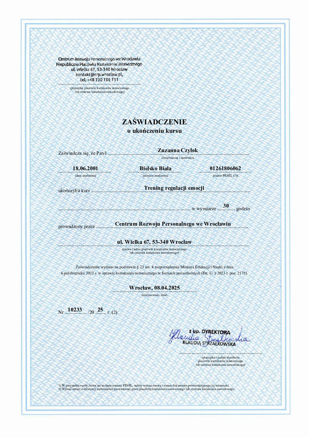 Ukończyłam szkolenia trenerskie z zakresu Treningu Umiejętności Społecznych I i II stopnia ze specjalnością dzieci w spektrum (TUS) oraz regulacji emocji, a także liczne kursy specjalistyczne związane z terapią i wspieraniem rozwoju dzieci.